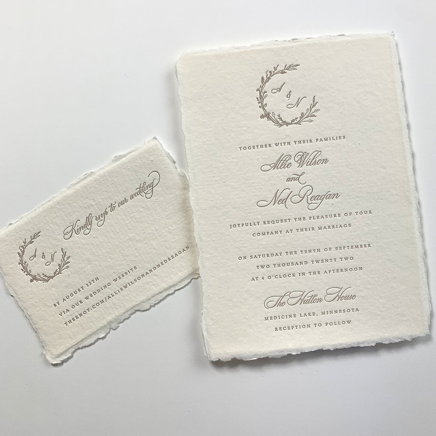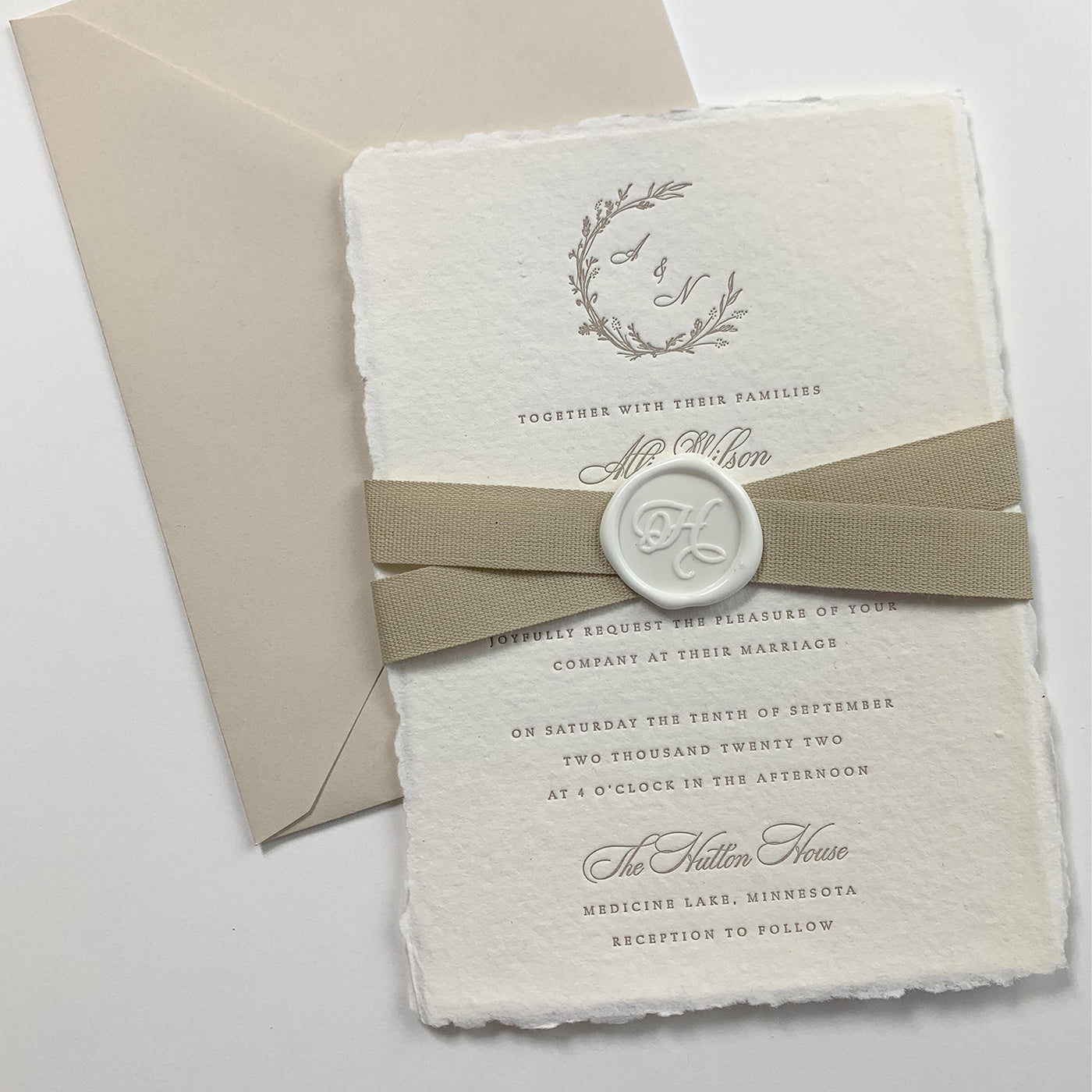 A delicate crescent wreath with branches and foliage encircle your monogram. This simple letterpress invitation is printed on our soft white handmade deckled paper. A neutral beige envelope invokes a casual elegance with a subtle hint of color.