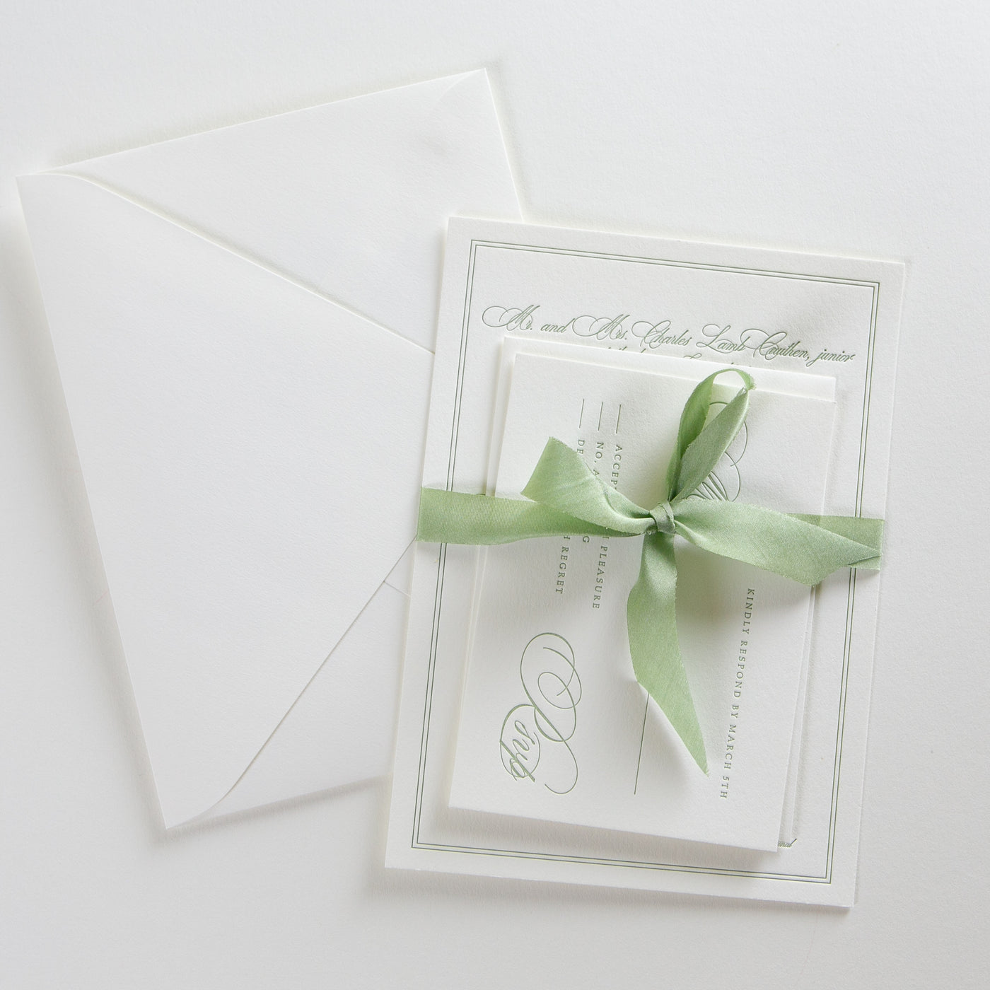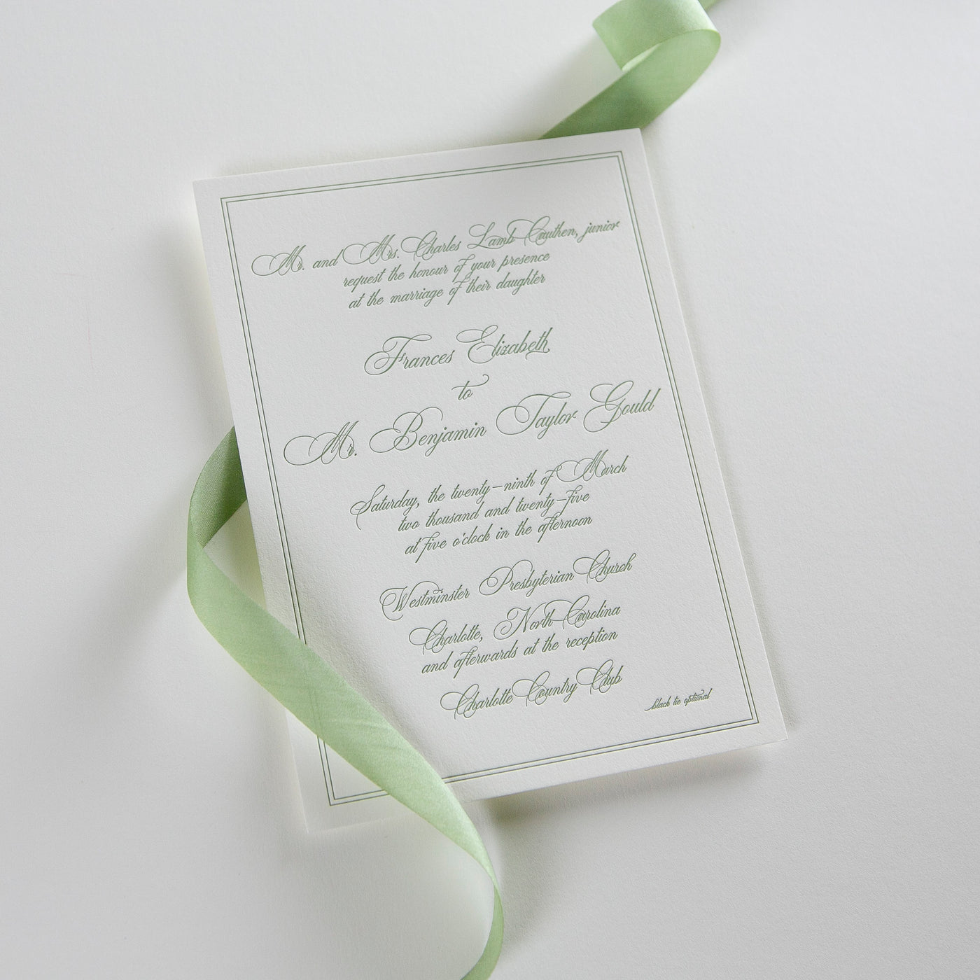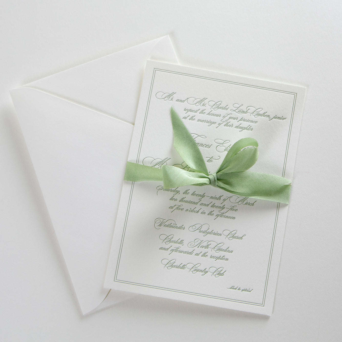 We love this elegant scripted letterpress invitation with a delicate, double border. There are many different script fonts to pair with this classic letterpress invitation design. There are many ways to customize this suite with added details cards, rehearsal dinner cards, or weekend event cards.