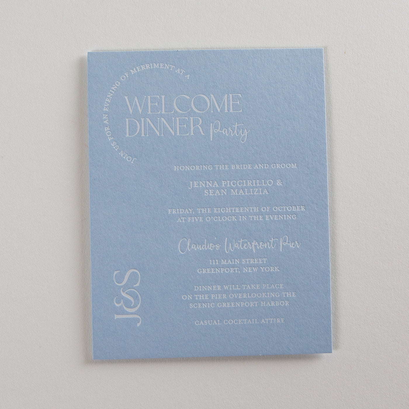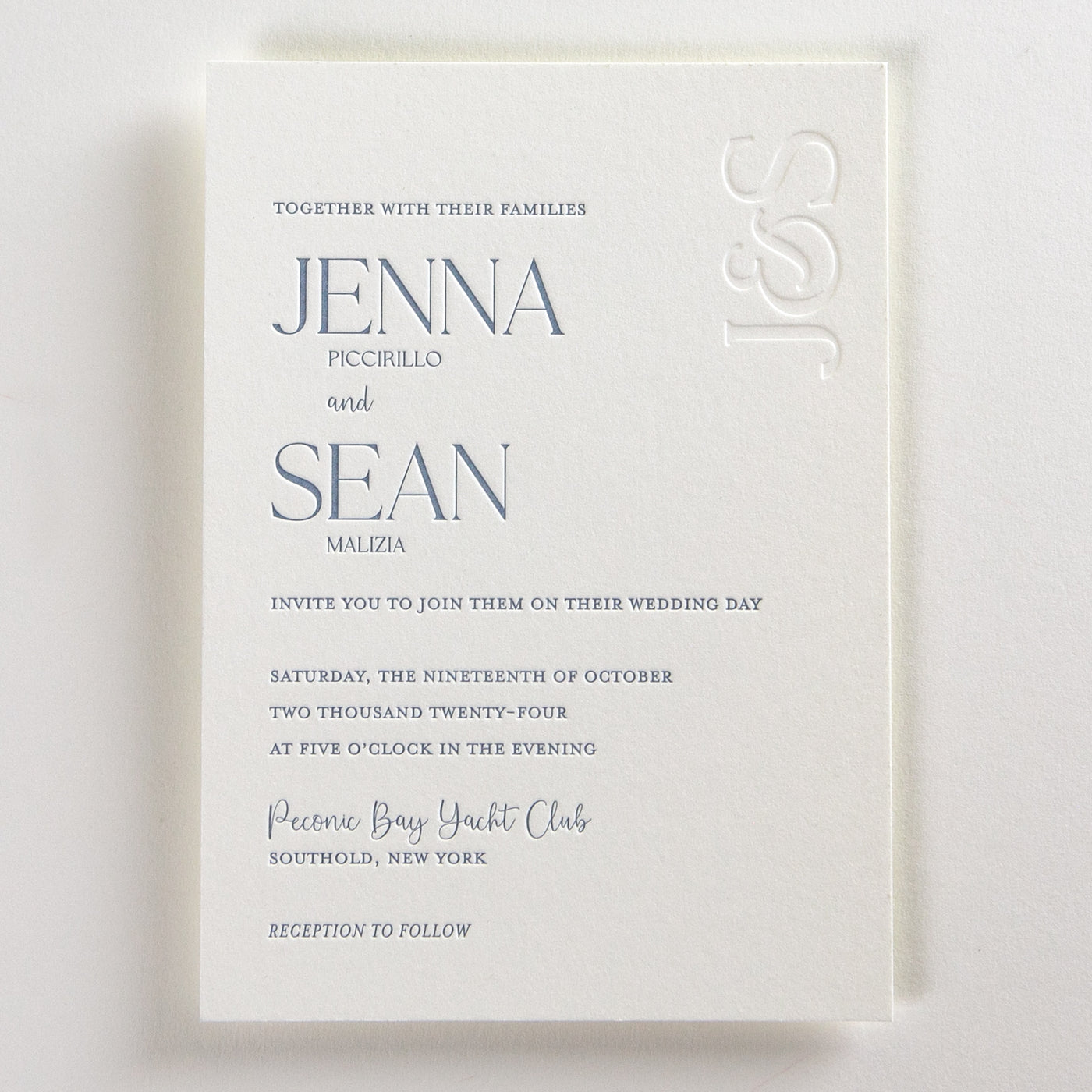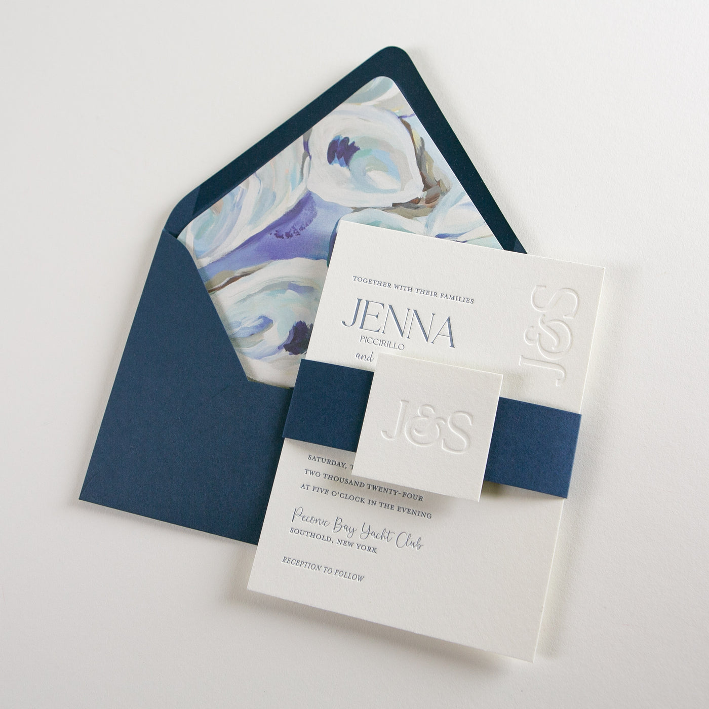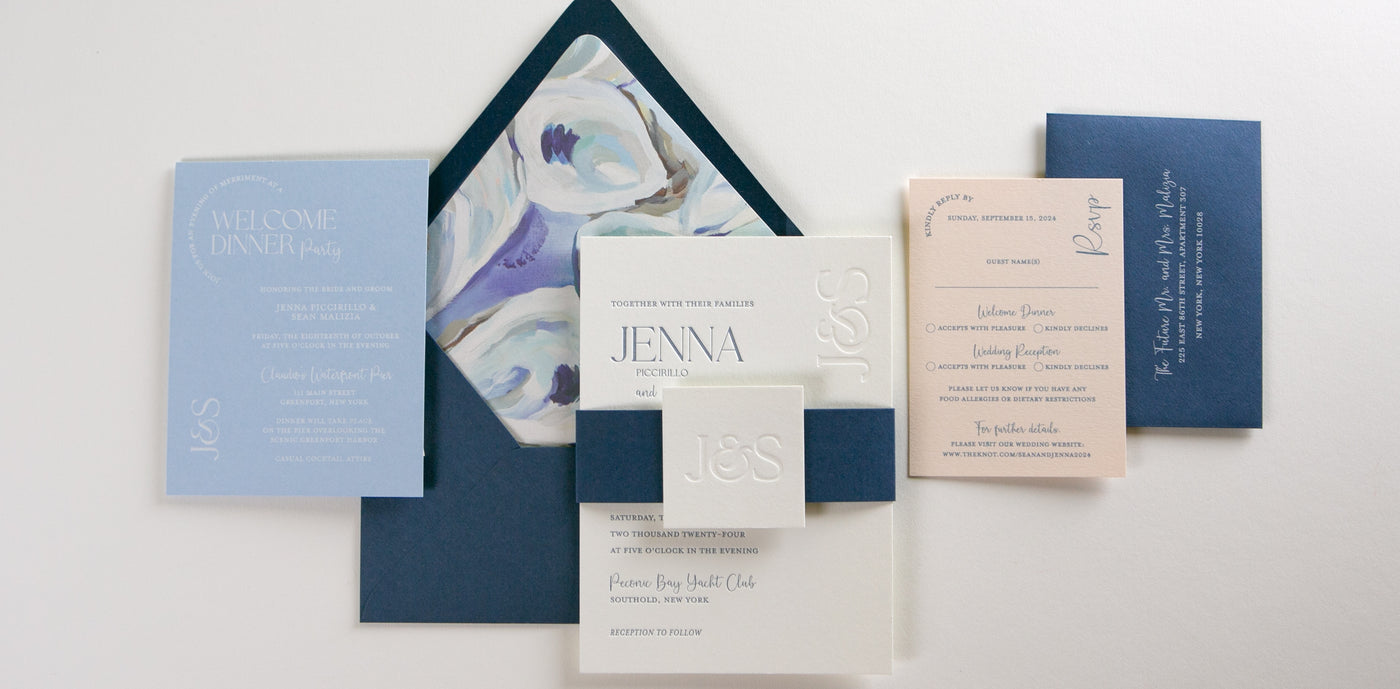 Bold, blind debossed monogram with a fun ampersand to connect your initials. This letterpress wedding invitation suite has some fun and colorful elements including a contrasting belly band and letterpress tag for your monogram. Select a fun pattern or image for your custom envelope liner to add more visual interest to your suite. All elements of this design can be customized to your unique style. If you don't see a specific item here we can always add custom watercolor maps, custom illustrations, as well as guest addressing or calligraphy for your wedding invitations.